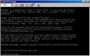 ANSiMat is a graphical viewer of ANSI art files. It can also be used to convert ANSI (or plain ASCII) files into regular (BMP, TGA, PCX...) graphic files, or into animations (FLC). Altough not initially designed for this, ANSiMat can be successfully used as an ASCII art viewer, or even simple text files viewer. |